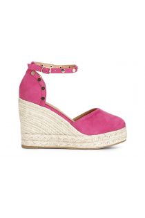Cord wedge sandals with fabric ankle strap closed front and back with gold studs.