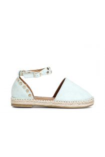 Sandals closed at the back and with a fabric ankle strap with studs on a cord base.