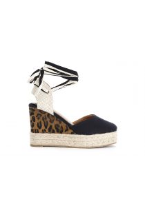 Canvas sandals with double gladiator lace-up and cord wedge and spotted print fabric.