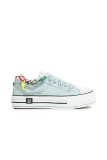 Fabric sneakers with glitter detailing on the back and an accessory with chain and coloured details included. box sole with decorative stripes.