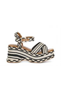 Sandals with ethnic cross. wrapped wedge always in ethnic fabric. the comfortable genuine leather insole makes the shoe comfortable even after several hours of use. the heel is 8 cm high while the plateau is 4 cm.