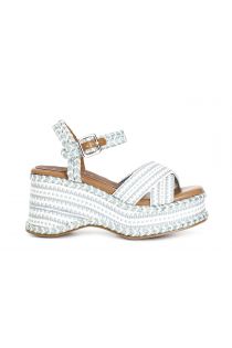 Sandals with ethnic cross. wrapped wedge always in ethnic fabric. the comfortable genuine leather insole makes the shoe comfortable even after several hours of use. the heel is 8 cm high while the plateau is 4 cm.