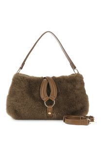 Faux fur shoulder bag with a decorative band and ring. Logo on the back and removable shoulder strap with snap hooks for versatile and chic portability.