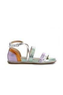 Multicoloured laminated faux leather low sandals in pastel tones. clad heel and ankle strap.