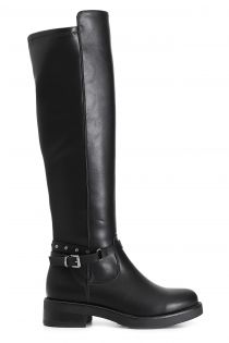 Women's stretch panel boot featuring a removable ankle strap with studded straps and ornamental buckle. the insole is leather.