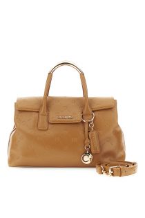 faux leather bag with flap and tubular handles tan