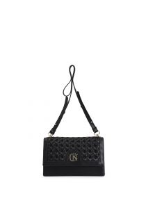 Shoulder strap with flap with woven wicker effect panel. metal logo on the front of the bag. tubular handles. magnetic clasp. bag with two internal compartments. adjustable shoulder strap.