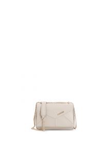 Flap with patchwork workmanship and micro rivet applications. bag divided into various compartments: a partition closed with zip and pocket. shoulder strap with chain.