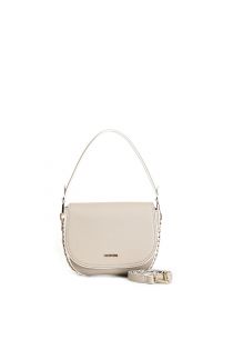 Shoulder bag with flap made of hammered material with chain detail with threading on the side. zip closure. bag with shoulder strap.