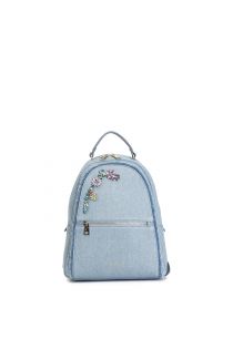 Frayed denim backpack with stone and rhinestone flowers. large zipped front pocket. backpack with single compartment. adjustable shoulder straps.