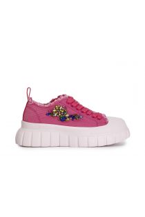 Frayed fabric sneakers embellished with an original rhinestone patch. rubber toe. closure with laces matching the shoe. 55mm raised sole decorated with a striped pattern.
