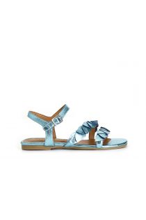 Low laminated leather sandals with double strap gilda model and ankle strap. front decoration resembling interwoven leaves.