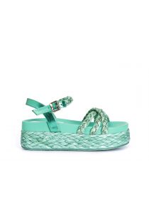 Colour block gilda model sandals with three intertwined raffia straps and a rhinestone insert. comfortable footbed and raffia-clad wedge.