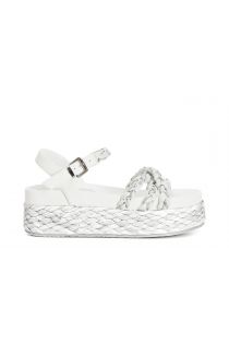 Colour block gilda model sandals with three intertwined raffia straps and a rhinestone insert. comfortable footbed and raffia-clad wedge.