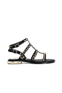 Gladiator sandals with double buckle decorated with faceted studs. the special shape of the heel makes the shoe super chic and super glamorous. comfortable padded insole for a soft fit. 20mm high heel. comfortable to wear and easy to pair with outfits.