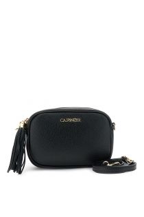 hammered leather camera bag with shoulder strap, snap hooks and tassel black