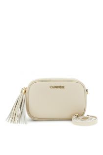 hammered leather camera bag with shoulder strap, snap hooks and tassel cream