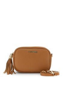 hammered leather camera bag with shoulder strap, snap hooks and tassel tan