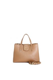 Hammered leather bag with flat handles zipped partition and decorative flap with logo. equipped with a removable shoulder strap for versatility and elegance.