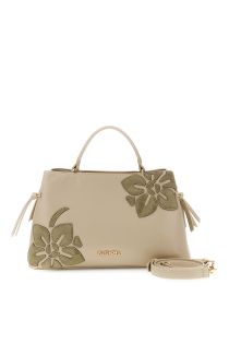 Elegant handbag in leather-look material with suede-effect floral appliques. featuring an internal divider a flat back pocket decorative knots on the sides and a removable shoulder strap. ideal for chic everyday looks. dimensions: 31.5 cm (length) × 19 cm (height) × 12 cm (depth)