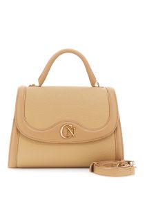 Elegant grainy faux leather handbag with a flap and padded frame. Metal café logo and removable shoulder strap with gold-tone snap hooks.