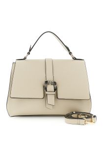 Faux leather handbag with flap and jewel buckle, contrasting ribs, internal partitions, back pocket and removable shoulder strap for chic versatility.