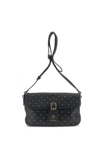Faux leather shoulder bag with decorative micro-stud flap and buckle pendant. Slim adjustable shoulder strap for a versatile look.