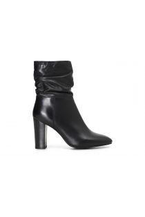 Leather ankle boots with wrinkled shank and high, thick heel.