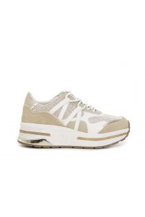 High-top sneakers in mesh fabric and patent leather inserts. Custom running sole with side logo.