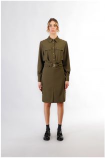 High-waisted skirt with large cargo-type side pockets made of fluid fabric. skirt equipped with a fabric sash to tie with logo buckle. above the knee length and front slit.