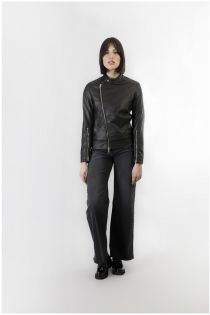 Biker jacket with front zip on sleeves. made of imitation leather with a laminate effect. side pockets and transversal zip closure. the lining is padded and quilted. versatile item to add to your wardrobe.