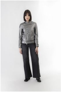 Biker jacket with front zip on sleeves. made of imitation leather with a laminate effect. side pockets and transversal zip closure. the lining is padded and quilted. versatile item to add to your wardrobe.