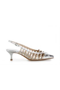 Laminated faux leather pumps with a play of side straps in a darker but matching shade. buckle on the back and medium heel.