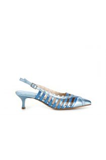 Dècollète in laminated leather with a play of side bands made with a darker but matching shade of color. Buckle on the back and medium heel