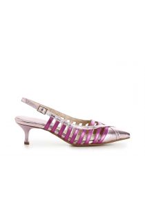Dècollète in laminated leather with a play of side bands made with a darker but matching shade of color. Buckle on the back and medium heel