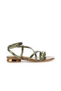Laminated leather-look sandals with an ankle strap and a rhinestone-embellished braided band. leather insole and 1.5 cm high sole. perfect for bright trendy summer looks.