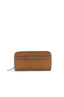 Large double zip wallet in grained leather with smooth contrasting faux leather trim and metal lettering.