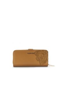Large leather-effect zip-around wallet with suede-effect flower appliqué and metal lettering