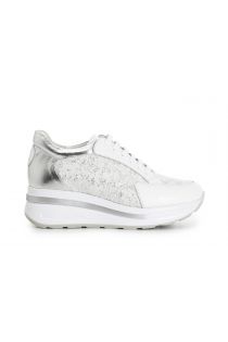 Leather sneakers characterised by elegant lace and patent effect appliqués. 40mm two-tone wedge sole with embossed logo.