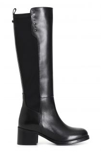 Women's studded leather and stretch boot. the heel is 50mm high and the insole is leather.