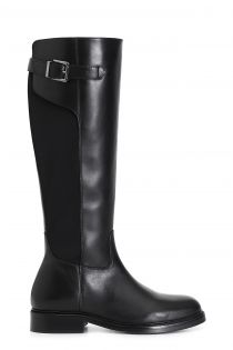 Women's boot made of leather and stretch lycra with decorative buckle. the heel is 30mm high and the insole is leather.