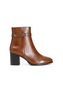 Women's leather ankle boot with an ankle strap and buckle. the heel is 65mm. comfortable leather insole.