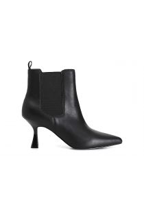 Women's leather ankle boot with 80mm high heel. side stretch panels make them easier to put on. the insole is leather.