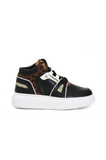 Leather ankle boots for a sporty, dynamic look, box sole with lacing, patent leather and animal print inserts. Metal logo on the side.