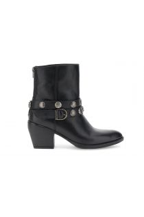 Black leather ankle boots with a removable ankle strap decorated with metal buttons. Leather lining and insole. A 7 cm heel for a bold and assertive style.
