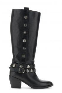 Leather boot with decorative buttons and a removable ankle strap for a bold touch. Leather lining and insole. 7cm wide, flared heel. Rock attitude with a sophisticated soul.