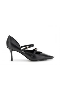 Leather pumps with double straps and a 7.5 cm thin heel. Tapered lines and gold details create an elegant, feminine silhouette with timeless appeal.