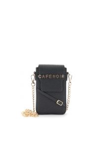 Leather-look cell phone case with a flap decorated with lettering stripes and a buckle. Detachable chain shoulder strap.