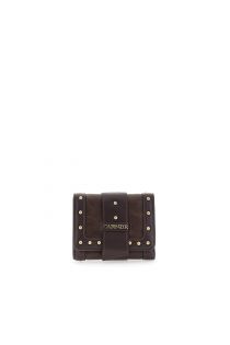 Leather-look wallet with flap and riveted loop. Zip closure with metal lettering.