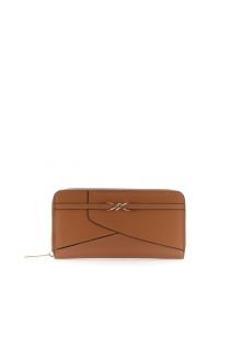 Zip-up leather-effect wallet with patchwork design and metal logo.